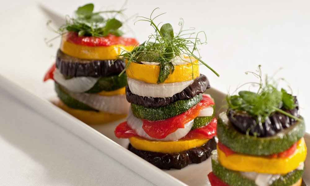 Å lage tårn av bakte grønnsaker som squash, aubergine, løk og paprika gir et fargerikt innslag på tallerkenen. Serveres som en egen liten rett, som forrett, tilbehør i stedet for salat eller som en tapasrett.