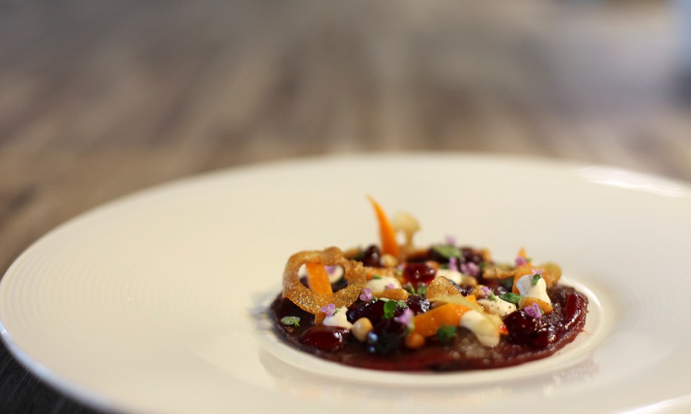 Carpaccio av lettrøkt reinsdyrplomme gulløyepotet og tyttebærvinaigrette