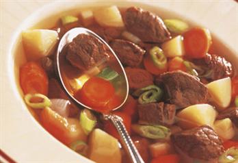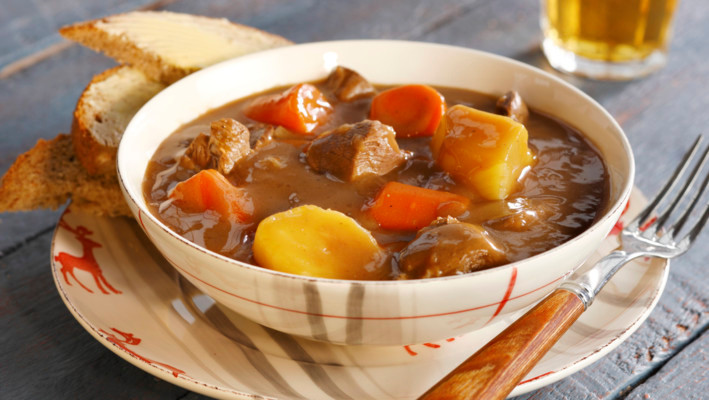 3. Skrell poteter og del dem i to. Skrell gulrøtter og kutt dem i tykke skiver. Hakk løken. Ha poteter og grønnsaker i gryta og kok til potetene er møre.