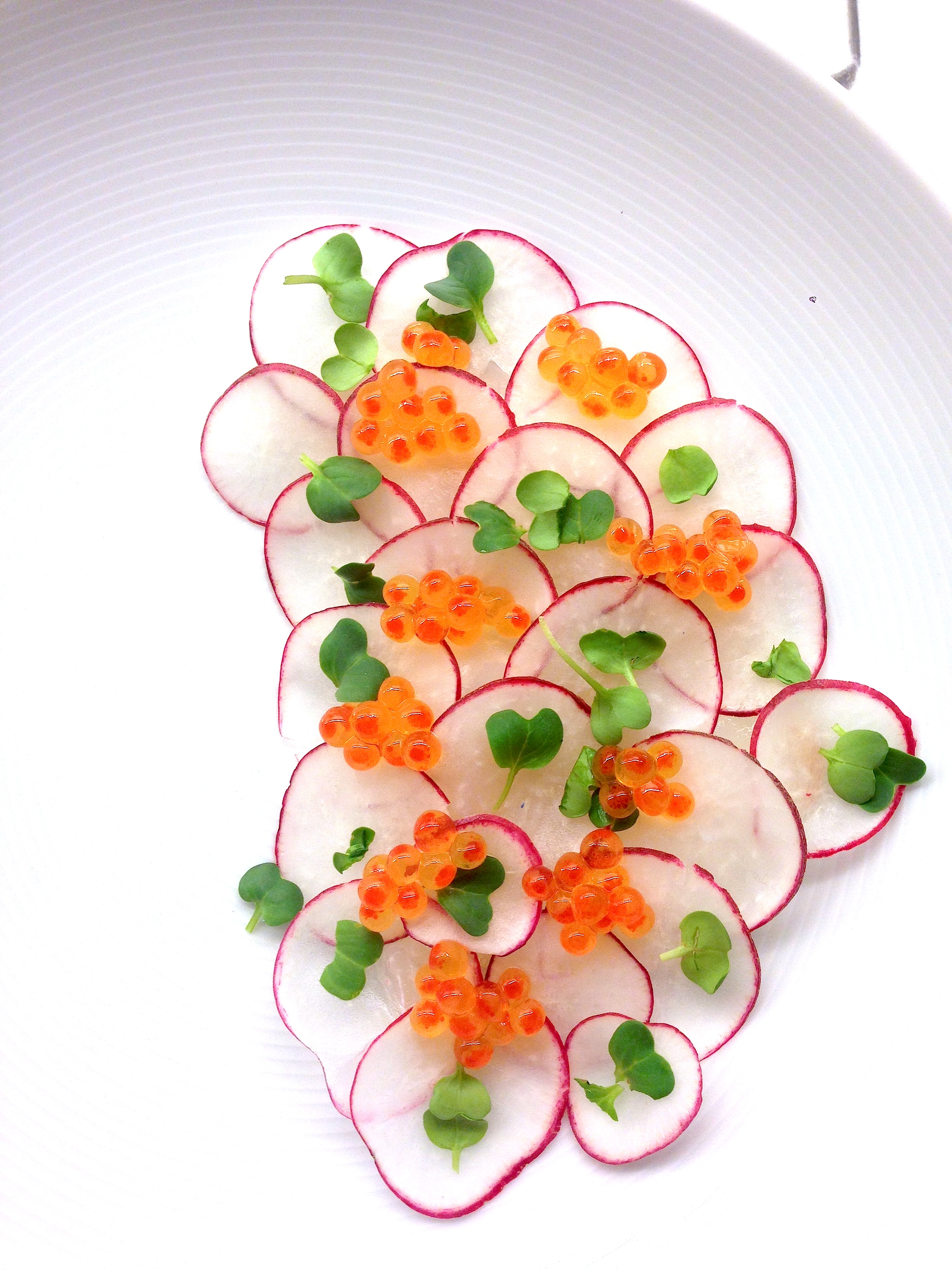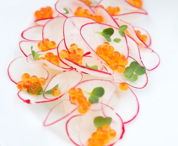 - Annrett reddiken som et lag av ”falsk fiskeskjell” over den mørnete torsken, og pynt med kaviar oppå toppen av retten.