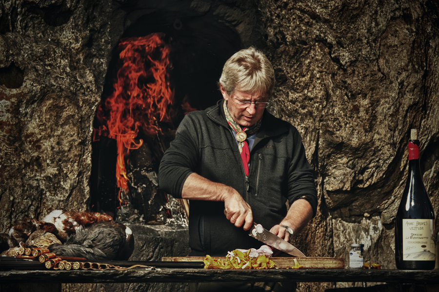 Når jeg kreker meg opp den siste bakken til Vianvang, som er hans spesielle spisested, er ullstrømpene nede på anklene. Både jakken og genseren har jeg kasta for lenge siden, og det flotte røde tørkleet jeg hadde rundt halsen, har den siste kilometeren fungert som svettebånd. Jeg skjønner at jeg ikke akkurat ser ut som noen velsmurt jeger, der jeg så vidt klarer å håndhilse på mesterkokken. Han smiler likevel da han møter meg ute på tunet. Heldigvis har han drikken klar, og heller straks rødvin fra Rhone i glassene og vi skåler i stillhet. Vinen er hans egen kritikerroste som passer utmerket til ryper og annen viltmat, men kan også nytes alene. Jeg heller innpå som om det er vann, samtidig som jeg forsøker å få pusten tilbake.