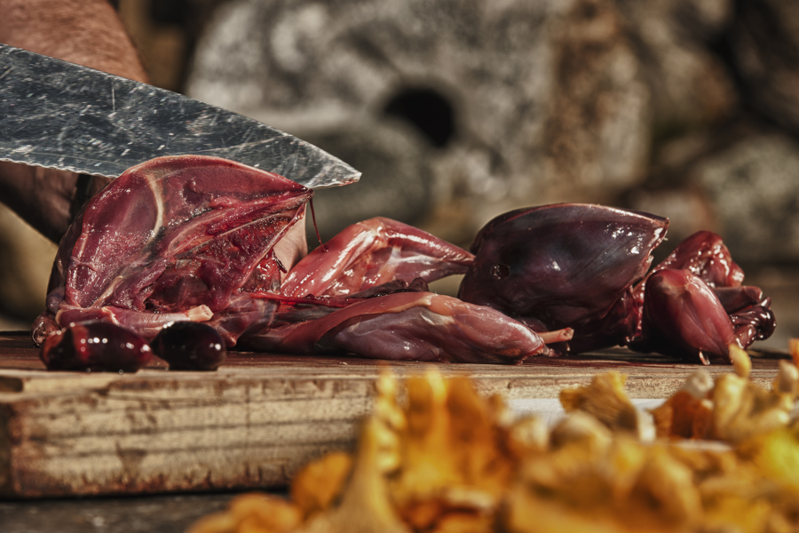 På tunet har han rigget til et maskulint utekjøkken, som sklir rett inn i den heftige naturen rundt oss. Et gedigent skiferhellebord fungerer som arbeidsbord, og ved siden av står en vedfyrt italiensk Nordica-ovn. I berget bak skiferbordet har en brønneborer laget en naturpeis i fjellet, og flammene sprer seg vilt og sultent oppover fjellet og skaper en trolsk stemning. I enden av uteplassen står en mektig statue laget av 2000 gevir fra rein. Den har han laget sammen med en kamerat, som en hyllest til det vakre dyret som vandrer i Jotunheimen. På skiferbordet ligger rypene klare, og fluene surrer ivrige rundt kadavrene og skaper en musikalsk forventning til noe stort. – Det er på denne måten eg lager rupe til meg selv, ofte er det enkle det beste, sier han smilende mens han klargjør redskapene.