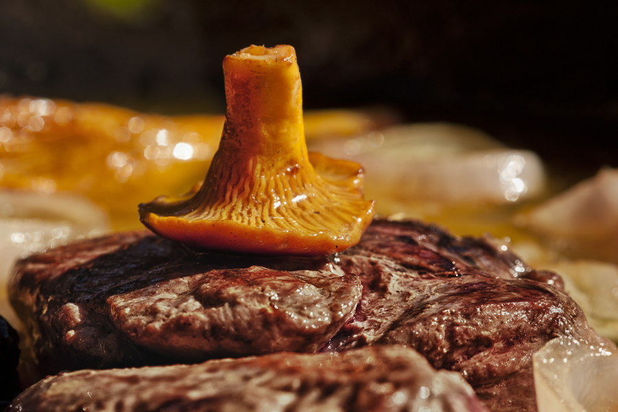 Han legger stekepannen av jern på ovnen, og tilsetter 2-3 spiseskjeer smør. Når smøret har fått en nøttebrun farge, hiver han oppi sjalottløken. – Lauken skal ikkje stekes brun, kun få en svakt gyllen farge, sier han og hiver kantarellene etter, som får surre en kort stund på middels varme. Duften av stekt løk i smør har begynt å pirre smaksløkene, og sammen med kantarellene, blir lukten enda mer forførende. Etter noen minutter i pannen, skyver han løken og soppen ut til sidene av stekepannen for å lage plass i midten. Her legger han rypebrystene med skinnsiden ned i noen få sekunder for at brystet skal holde fasongen. Så snur han dem, og steker dem i 3-4 minutter til. Han drysser over salt, men da jeg spør etter pepper, svarer han kontant. – Eg peprer aldri rupa mi, det drep det ville i ho. Så trer han små bjørkepinner gjennom rypehjertene, drysser litt salt over dem, og legger dem i pannen sammen med resten. Etter 3-4 minutter til tar han stekepanna av, og lar alt hvile i pannen like lenge som han stekte maten.