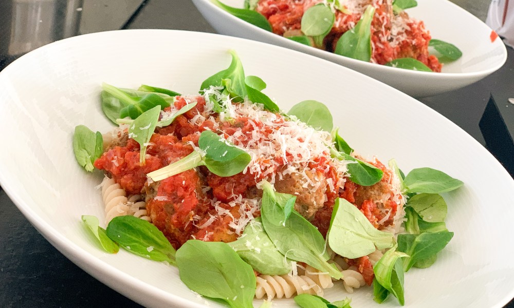 Det er alltid et stort kick å finne frem til en matoppskrift som «svinger-av-seg-selv». Dette er en av dem. Dersom du ikke finner Kjøttdeig av lam, kan du selvfølgelig bruke noe annet, men i disse nesten påske-tider, er lam «på alles lepper». Og så er det så utrolig godt. Jeg har også lovet meg selv og lage en versjon med stekt pancetta eller bacon biter i kjøttbollene. Jeg tror det blir en enda større smaksbombe. Vi får se. I mellomtiden prøves denne. Jeg hadde bare feltsalat denne dagen, men ruccola er hvassere og dessuten enda mer italiano.