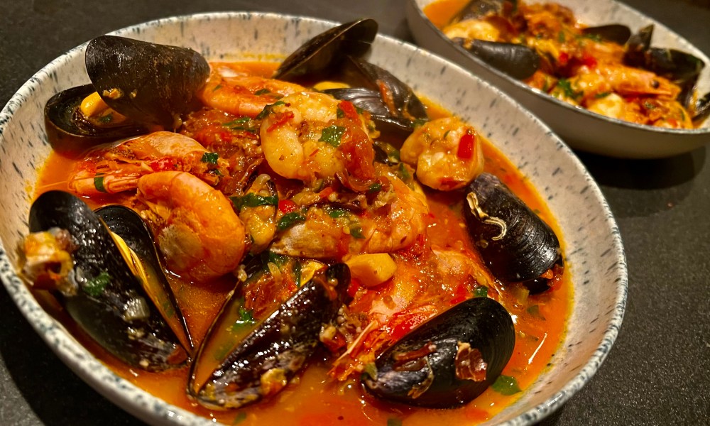 Jeg vet at slike retter som dette ofte er noe man tenker er best på sommeren. Men jeg kan trygt fortelle deg at det funker egentlig minst like godt på vinteren. Fordi reker og skalldyr er best på vinteren. Man kan dessuten legge i noen fiskestykker, for å gjøre gryten enda rikere, eller hvis man ikke har tilgang til skalldyr. Jeg brukte frosne reker, og blåskjell fra Scanfjord Målesund, som er rett over grensen i Sverige. Gode løsninger begge to. I tillegg fikk jeg bare tak i frosne biter av blekksprut.